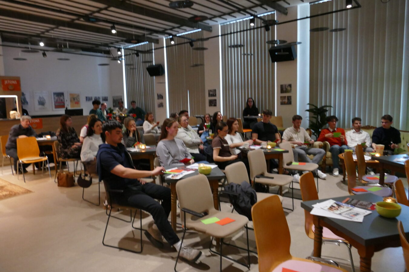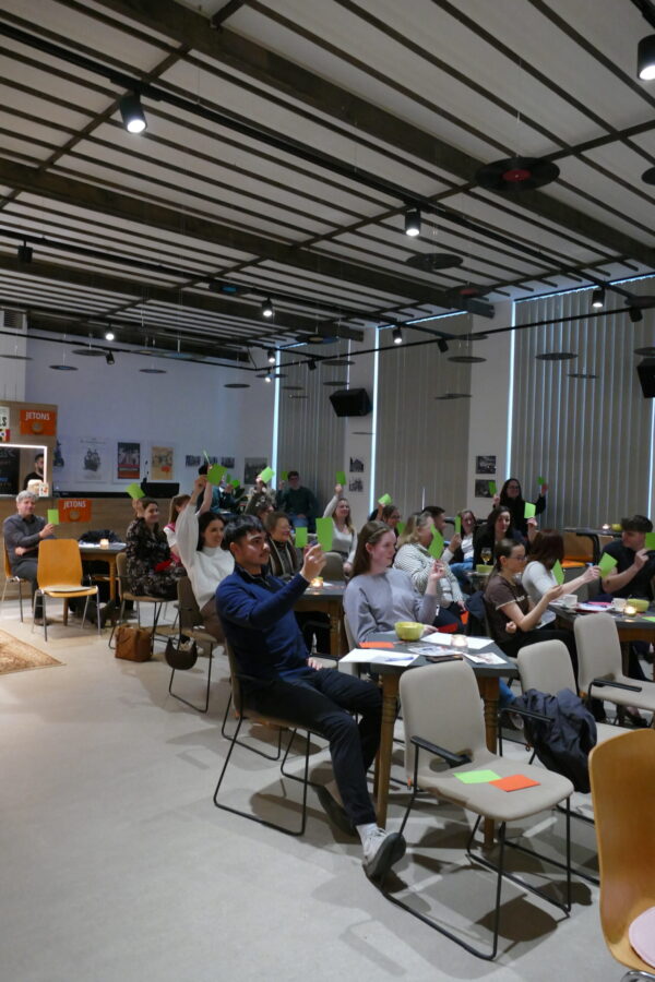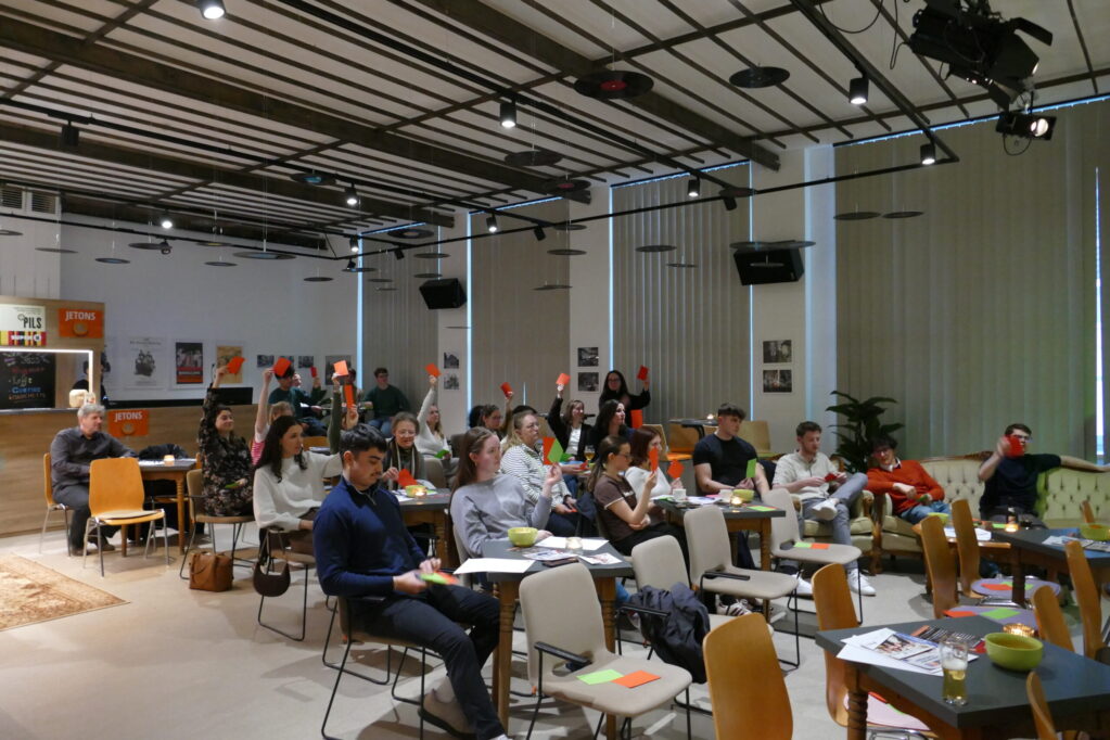 Aus diesem Grunde hat sich der RDJ für ein leicht interaktives Format der Partizipation entschieden. Alle Teilnehmer:innen bekamen zu Anfang eine grüne und eine rote Karte, die sie bei Abstimmung hochhalten konnten. So wurde beispielsweise deutlich, dass die große Mehrheit Sicherheit vor Freiheit in den Sozialen Medien bevorzugt: